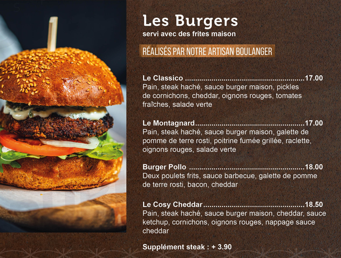 Découvrez notre sélection irrésistible de burgers au restaurant Le Cosy. Chaque bouchée est une explosion de saveurs et de textures ! Que vous préfériez un classique cheeseburger ou un burger végétarien savoureux, notre menu propose une variété alléchante pour satisfaire toutes les envies.